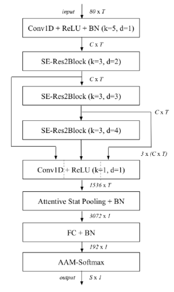 Attention Mechanism: The model uses an attentive statistical pooling layer to aggregate the frame-level features into a fixed-length speaker embedding. This attention mechanism helps the model focus on the most informative parts of the input audio.