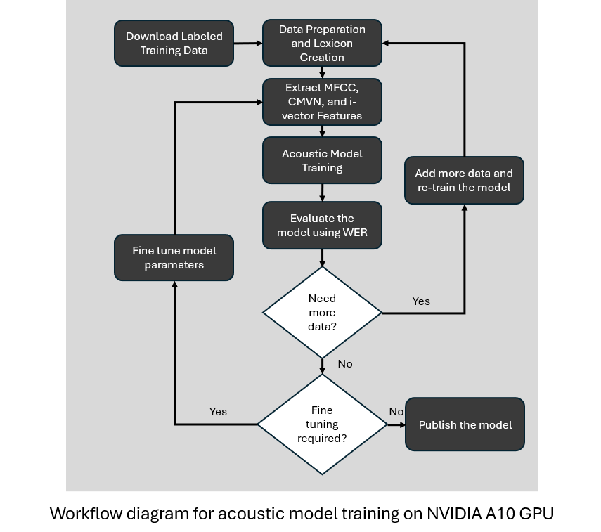 - The acoustic model based on TDNN (Time Delay Neural Network) is trained using Labeled Audio Data on an NVIDIA A10 GPU.